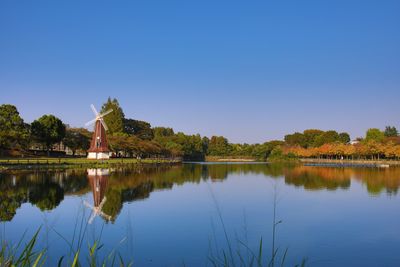 A distinctive windmill stands near Ukima Pond, functioning as the primary symbol of the park since its early development phase