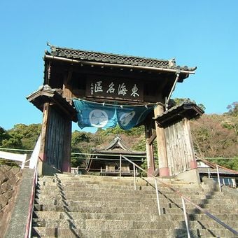 Seiken-ji is a Buddhist temple at the base of Mount Gao, featuring a traditional garden designated as a national site of scenic beauty. A prominent stone gate marks the entrance to the grounds.