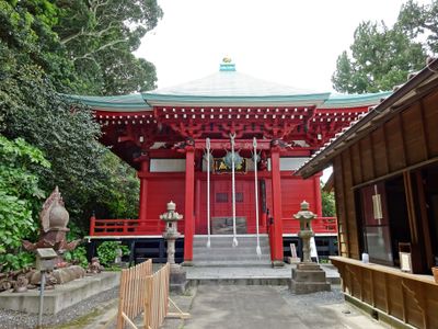 The Hatara Yakushi Temple stands near the Hatara coast, featuring a prominent red building structure and traditional Japanese architectural elements.