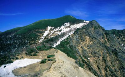 Mount Eboshi reaches an elevation of 2,726 meters in the Northern Japanese Alps, featuring steep slopes and rocky outcrops near its peak.