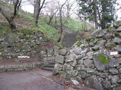 The eastern base of the castle features a large masugata gate with Ano-zumi style stonework, constructed during the governance of the Gamou clan.