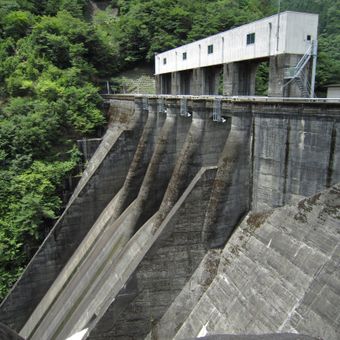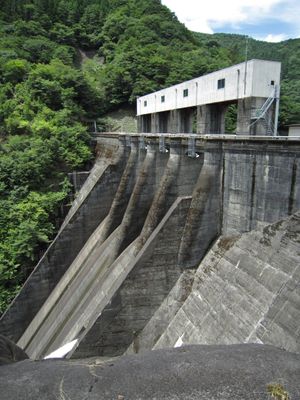 The concrete structure of Sarutani Dam stretches 170 meters across the Kumano River while reaching a height of 74 meters above the riverbed.