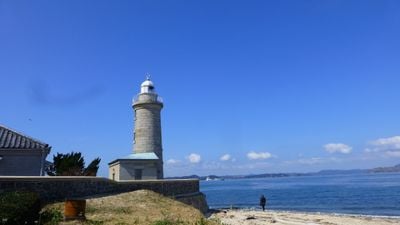 Ogijima Lighthouse is a granite structure standing 14 meters high at the northern tip of Ogijima Island. The lantern chamber emits white, green, and red flashes every ten seconds to guide vessels navigating the strait.
