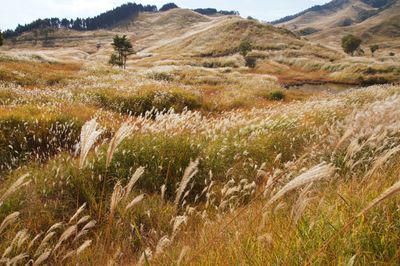 The Tonomine Highlands extend across 90 hectares of rolling hills covered with Japanese pampas grass, creating expansive natural patterns in western Japan.