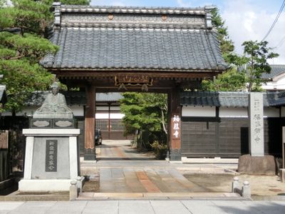 The temple grounds contain the statue of a notable local figure, adding historical significance to this religious establishment in Shibata.