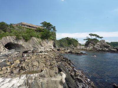 The Bentenjima rock formation and Jumonji-do sea cave display natural erosion patterns, created by waves over millions of years.