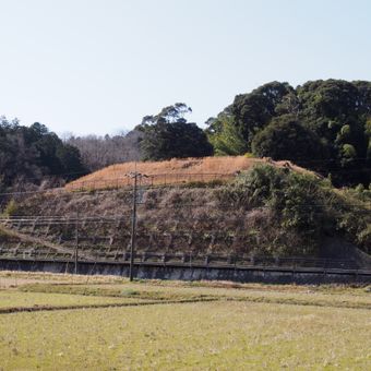 Akasakaimai Tumuli is an archaeological site featuring a large burial mound perched on a hilltop overlooking a narrow valley that leads toward the sea. The site contains a total of 25 burial facilities spread across the summit and base areas.