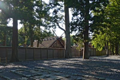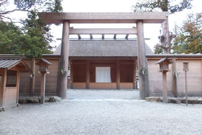 The Outer Shrine of Ise Grand Shrine follows Shinmei-zukuri architecture, featuring wooden structures with raised floors and thatched roofs in Toyokawachō.