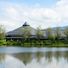 The Karuigawa Ohga Hall features modern architecture with glass panels, wood elements, and metal structures that form a harmonious composition within its mountain setting.