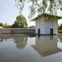 A large opening in one building frames the pool like a picture and directs the eye toward the surface of the water. A small concrete structure stands in the rear section among low plants and stones.