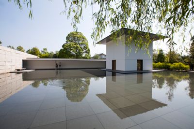 The D. T. Suzuki Museum consists of three connected pavilions arranged around a shallow reflecting pool, built with clean lines and minimal forms. The pool mirrors the surrounding structures and trees, forming a central focus for the entire site.