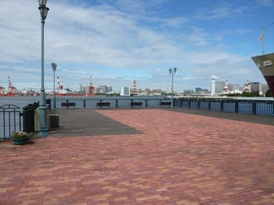 Aomi Kita Port Park extends along the waterfront of Tokyo Bay, featuring walking paths and recreational areas near container terminals and maritime facilities.