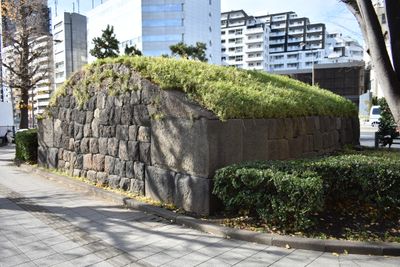 The foundation remnants of a large wooden gate mark the entrance to the historical city of Edo, featuring stone walls spanning nine meters in width.