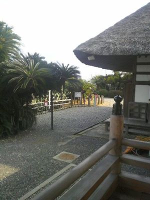 The temple compound features a main hall surrounded by traditional Japanese gardens with stone paths and carefully maintained vegetation including cycads and opuntia plants.