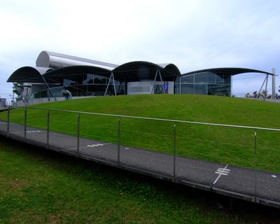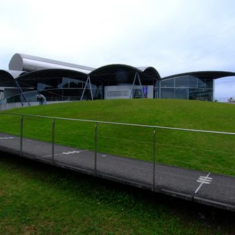 The museum building features a glass pavilion with a steel canopy and a horizontal half-cylinder roof designed by architect Toyo Ito.
