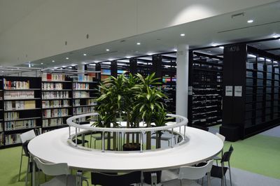 The Anjo City Library features a five-story building with reading rooms, study areas, and meeting spaces across multiple floors for community engagement.