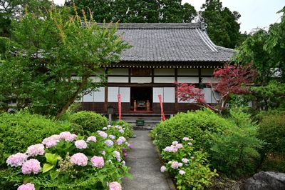 Located at the foot of Ikeda Mountain, Yuge-ji temple grounds contain a pond with a waterfall, bamboo groves, and 20,000 hydrangea plants.