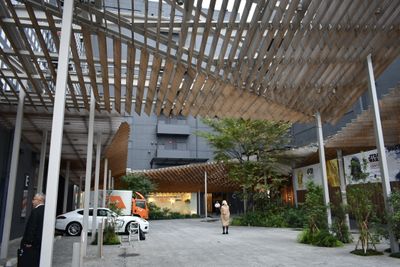 The exhibition space presents works by Japanese architects Kengo Kuma, Jun Aoki, and Shigeru Ban alongside international architectural designs.