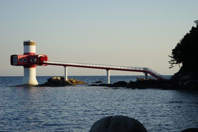The red and white cross-shaped tower stands above water and connects to land through a metal bridge, offering views of marine life through porthole windows.