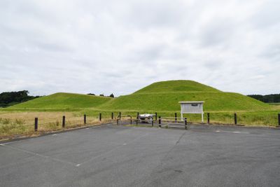 The Zanmaiduka Kofun measures 85 meters in length, featuring a circular rear section of 47 meters diameter and a rectangular front portion 36.5 meters wide.