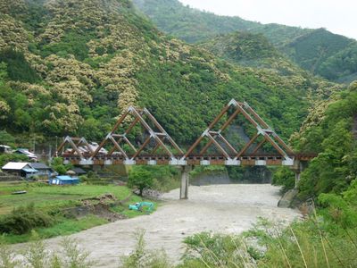 The bridge features gradients of 6.1% on the Shimane side and 5.1% on the Tottori side, making it Japan's largest rigid frame bridge construction.