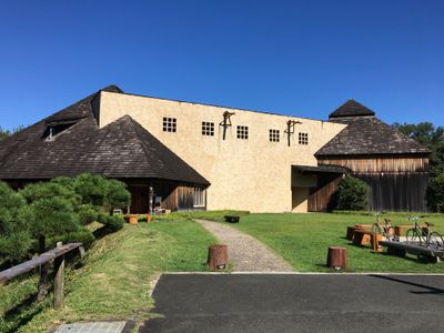 Visitors reach the museum via a walking path from the parking area and must remove shoes before entering the exhibition spaces.