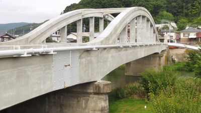 The concrete arch bridge spans across the Shinano River, connecting different sections of Sakuho town in Nagano Prefecture.