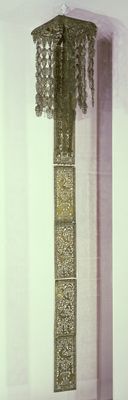 The Banner for the Kanjo features gilt bronze openwork sheets adorned with Buddha figures, heavenly beings, clouds, and arabesque patterns throughout its length.