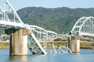 The Mukou Water Bridge stretches 546.85 meters across the Kinokawa River, carrying water through large pipes supported by concrete pillars.