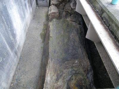 This preserved section of petrified wood stands near the West Japan Industrial Club and Kyushu Institute of Technology, forming part of local geological education.