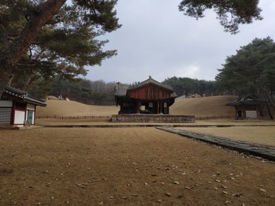 Changneung burial site contains structured pathways leading to the main tomb area, surrounded by stone figures and traditional architectural elements marking its boundaries.