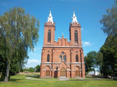 Construction of the brick church began in 1898 under Father K. Kibelis's supervision and reached completion in 1902, replacing an older wooden structure.