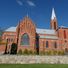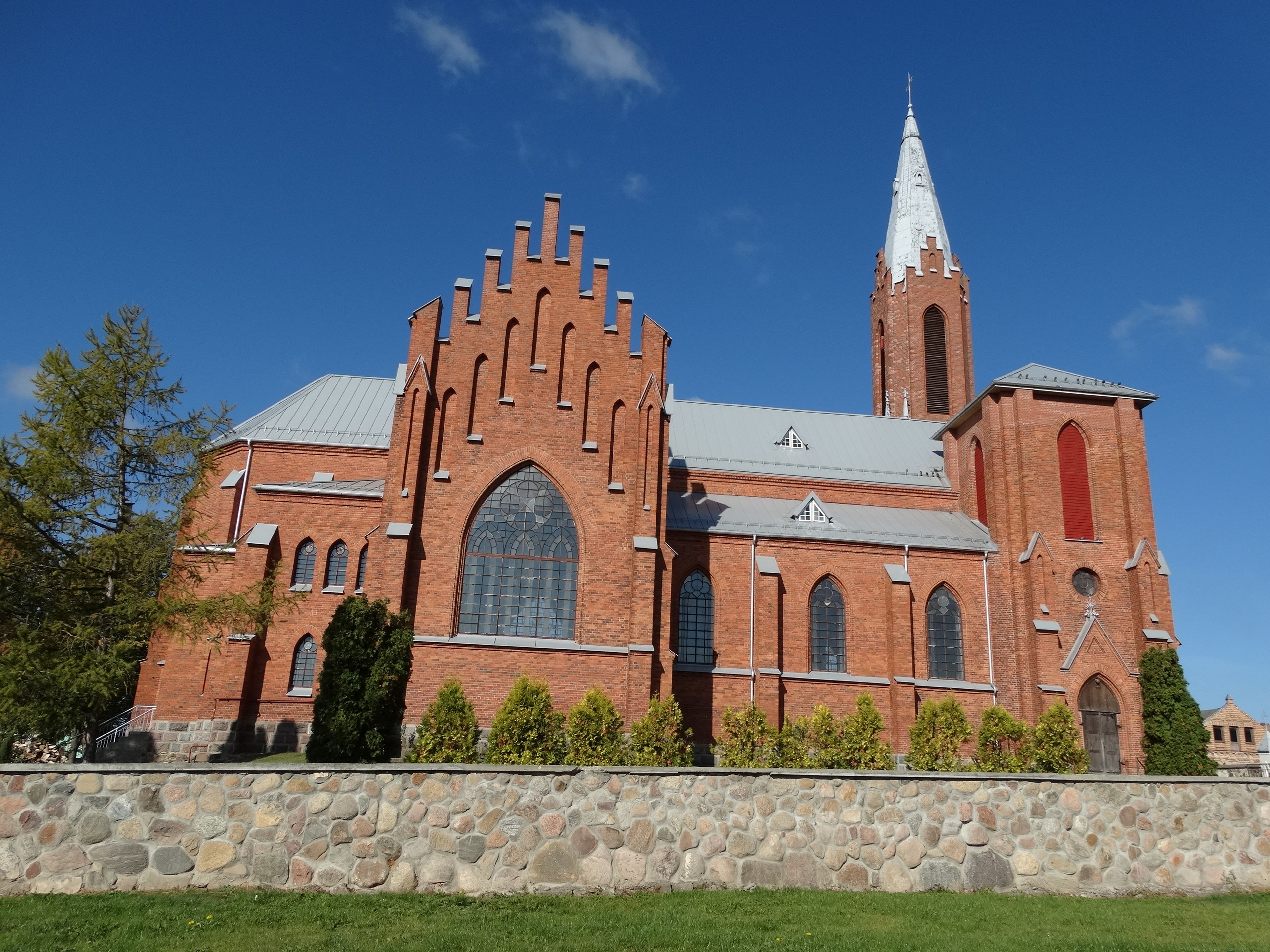 The Church of St. James the Apostle features traditional Lithuanian architectural elements with brick construction and precise geometric shapes throughout its structure.