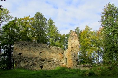 Gaujiena Castle is a stone fortification that stands on elevated ground beside the Gauja River, built during the 13th century. The visible walls and structures show the scale of the original building and how its spaces were once arranged.