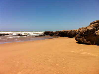 The white sand beach stretches along the Atlantic Ocean, where waves meet the shore beneath the expansive Moroccan sky with a remote character.
