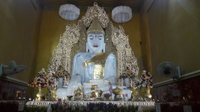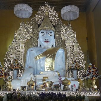 The temple contains a large Buddha statue carved from a single block of pale green marble quarried from Sagyin, measuring 37 feet in height.
