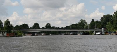The bridge carries five traffic lanes in total, with two lanes heading out of the city and three lanes directed toward Amsterdam's center.