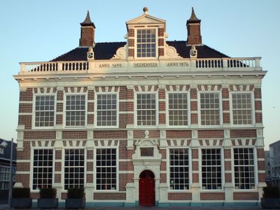 The stone structure features classical Dutch architectural elements with symmetrical facades and large windows arranged in a traditional pattern throughout the building.