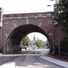The viaduct exhibits architectural elements of medieval city gates, incorporating red brick in cross bond pattern combined with natural stone elements in its construction.
