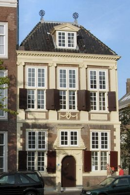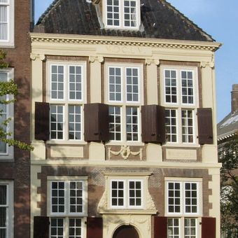 Pand met brede bakstenen gevel. Statig patriciershuis, rechte kroonlijst, gebeeldhouwde houten middenpartij in régence vorm. Hardstenen bordestrap met gesmeed ijzeren leuning