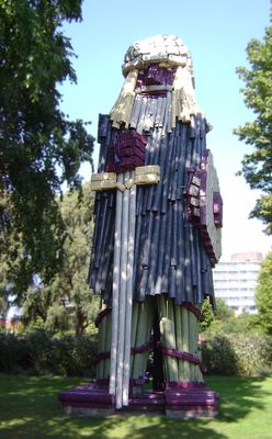 The Viking statue stands twelve meters tall on Van Randwijcklaan, featuring five different colors and displaying characteristics of childlike design elements.