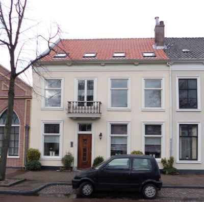 Pand met rechte kroonlijst, ingang met houten omlijstingen, plat dak