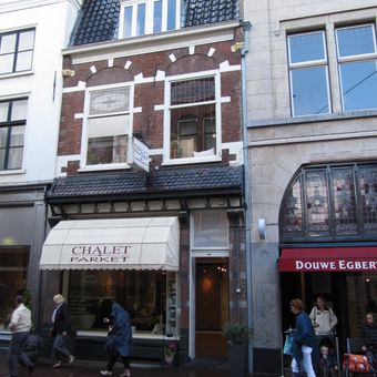 Pand met klokgevel, 1747, gebeeldhouwde natuurstenen voluten op de hoeken aan weerszijden