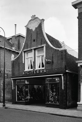 Pand onder zadeldak tegen klokgevel met gebeeldhouwde lijsten en aanzetkrullen en beeldhouwwerd in de top, Rijksmonument op Midstraat 91