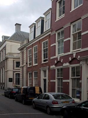 Pand met gevel met rechte kroonlijst en pilasterstelling om de deur, building in The Hague, Netherlands