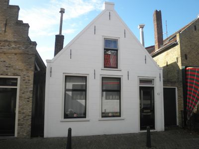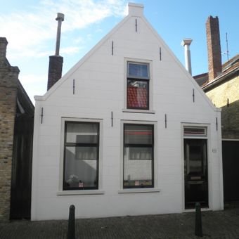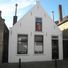 Pand met gepleisterde puntgevel en oude kozijnen met spiegelglas onder zadeldak