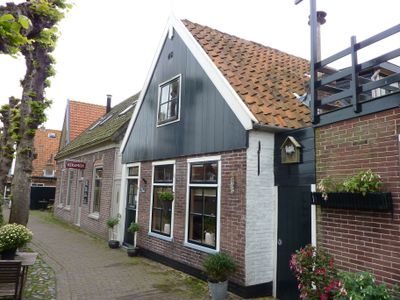 Klein huisje onder een dwars dak met de nummers 8 en 12. Aardige details aan vensters. Luiken en goede deur. Achterschot