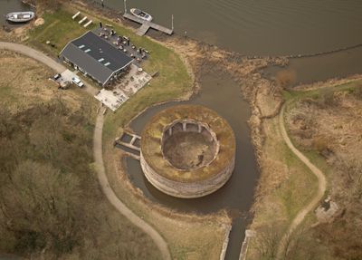Fort Uitermeer sits on the eastern bank of the Vecht River and features a circular tower with a diameter of about 30 meters across two levels. The structure combines military design with water management functions, demonstrating Dutch fortification techniques of that era.