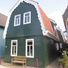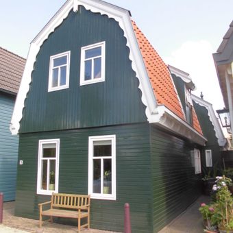 Houten huis met zolderverdieping onder mansarde kap met verbindingsbalk tussen de boeiborden en makelaar; T-vensters