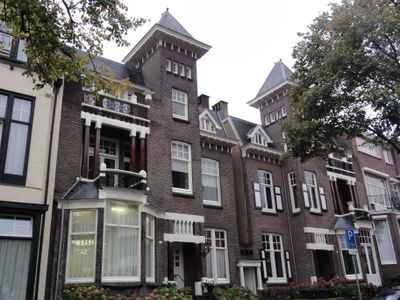 Rijtje van drie aaneengebouwde herenhuizen met hekken, thans met etage- en/of kamerverhuur